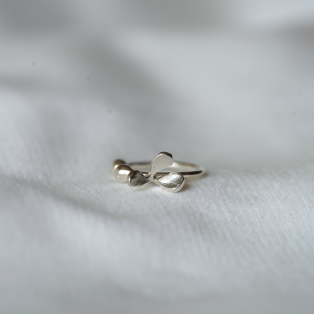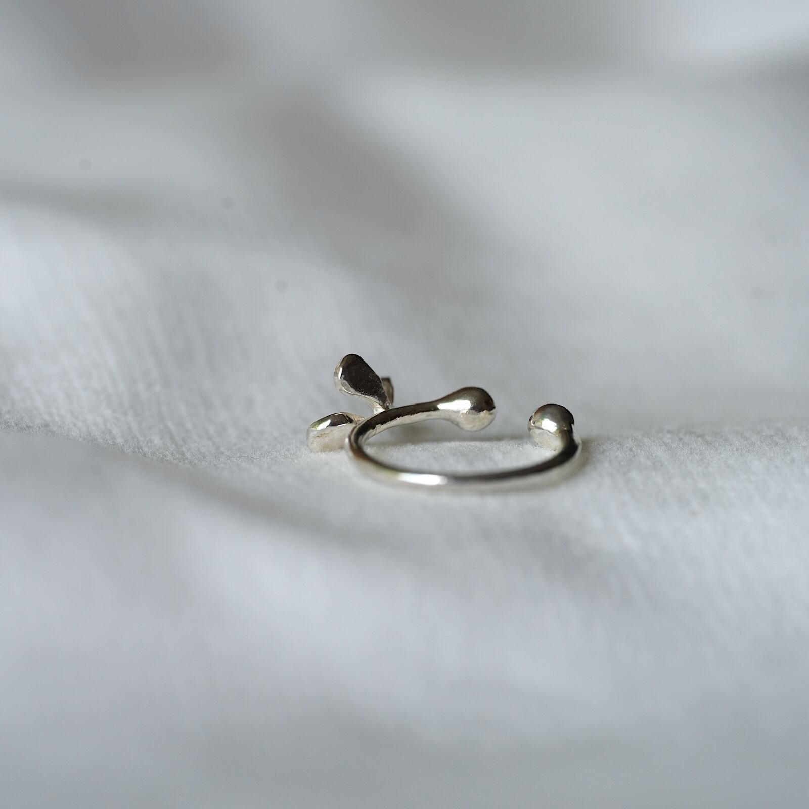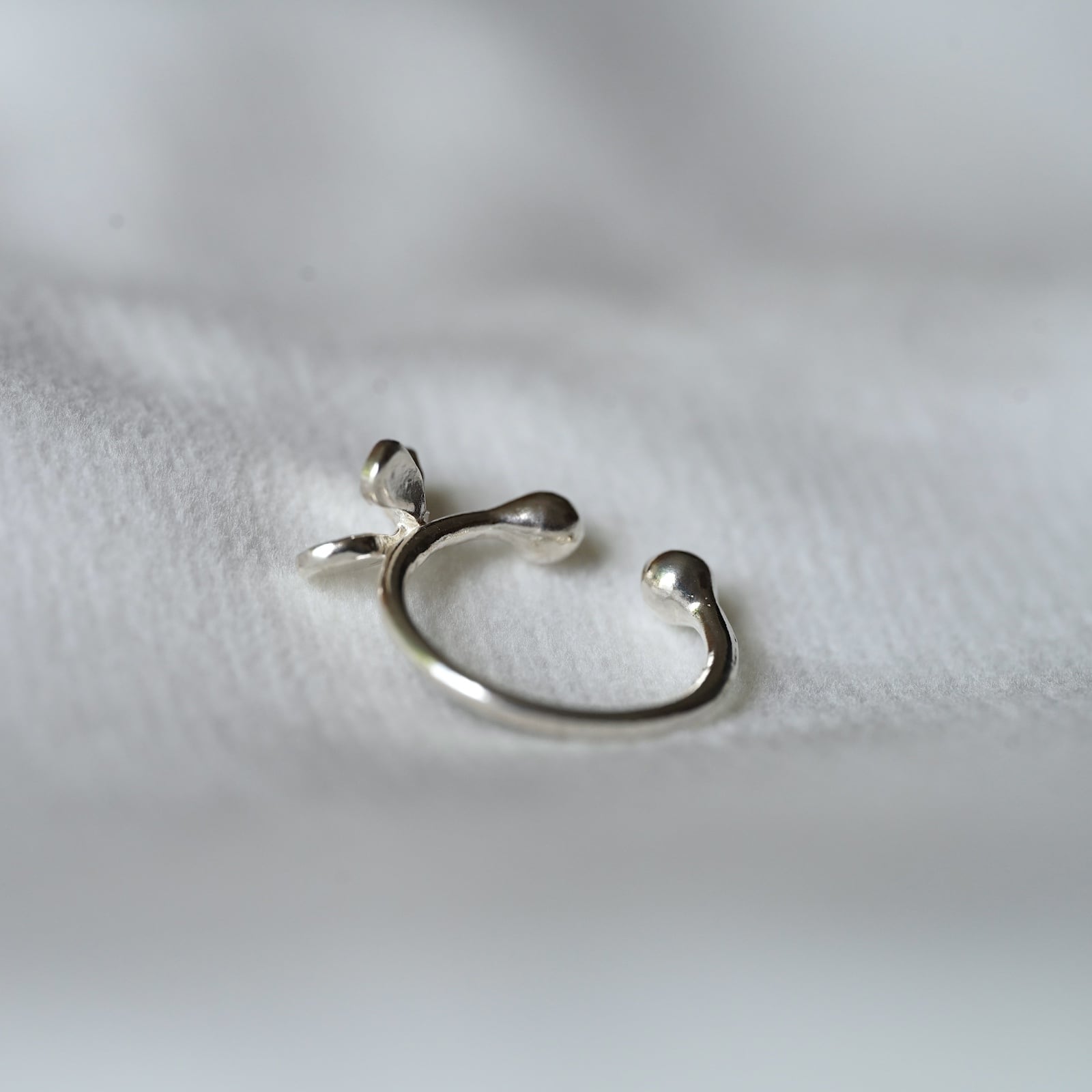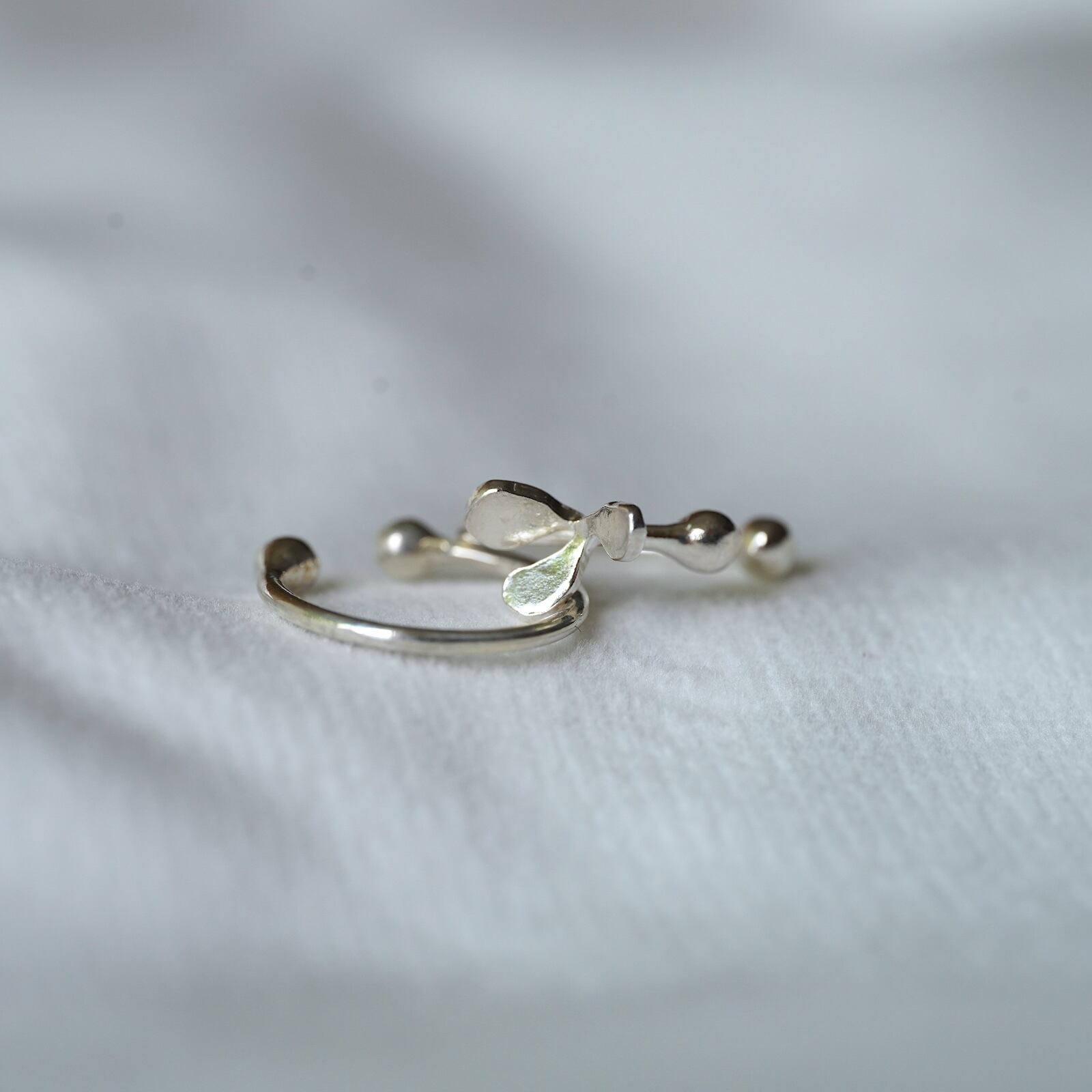 三つ葉のモチーフを付けたイヤーカフ(右耳用)です。プレーンイヤーカフとの重ね付けや、天然石のイヤーカフとペアで使用するとまとまります。