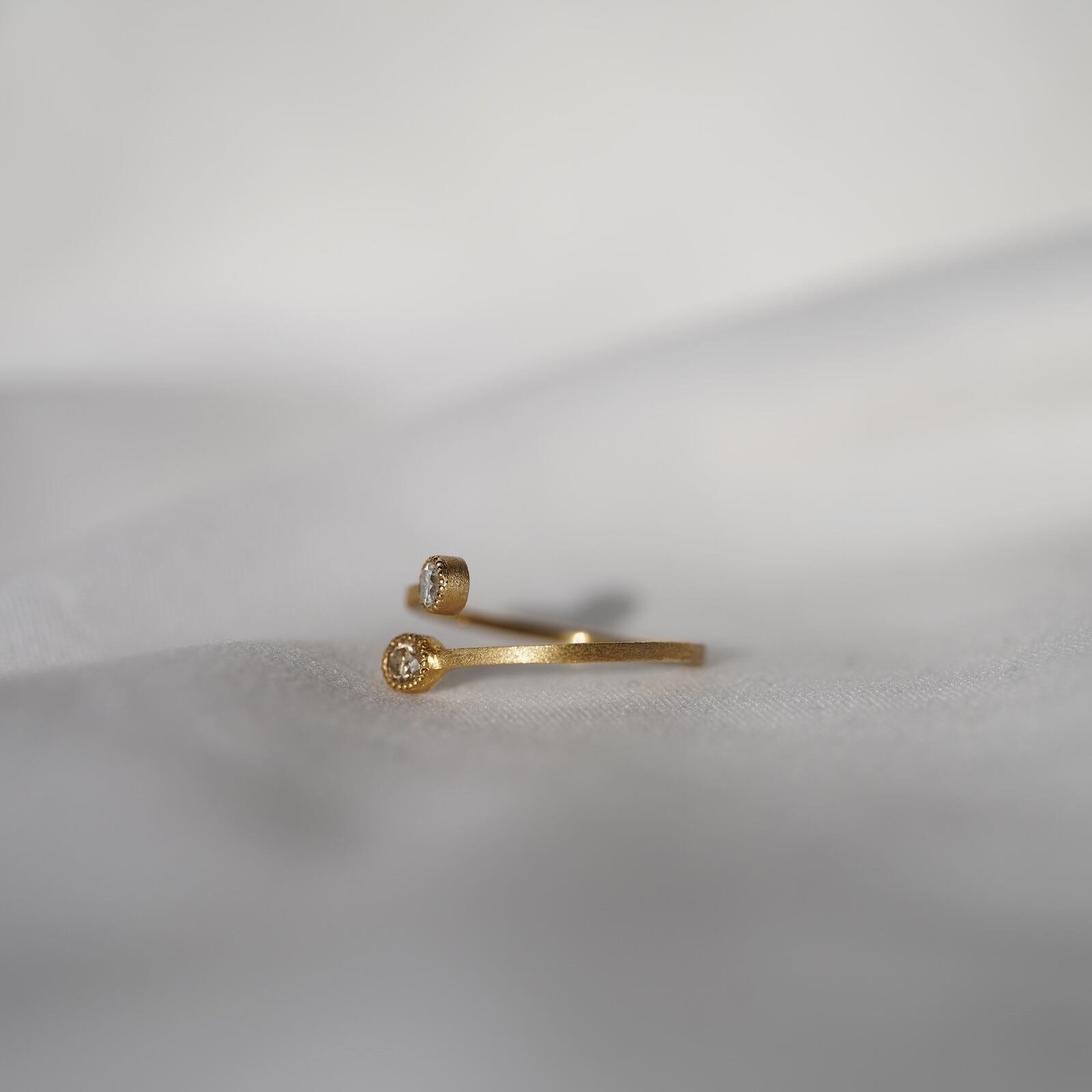 2つのダイヤモンドをミル留した魔法使いが着けていそうなK18のツインダイヤモンドリングです。